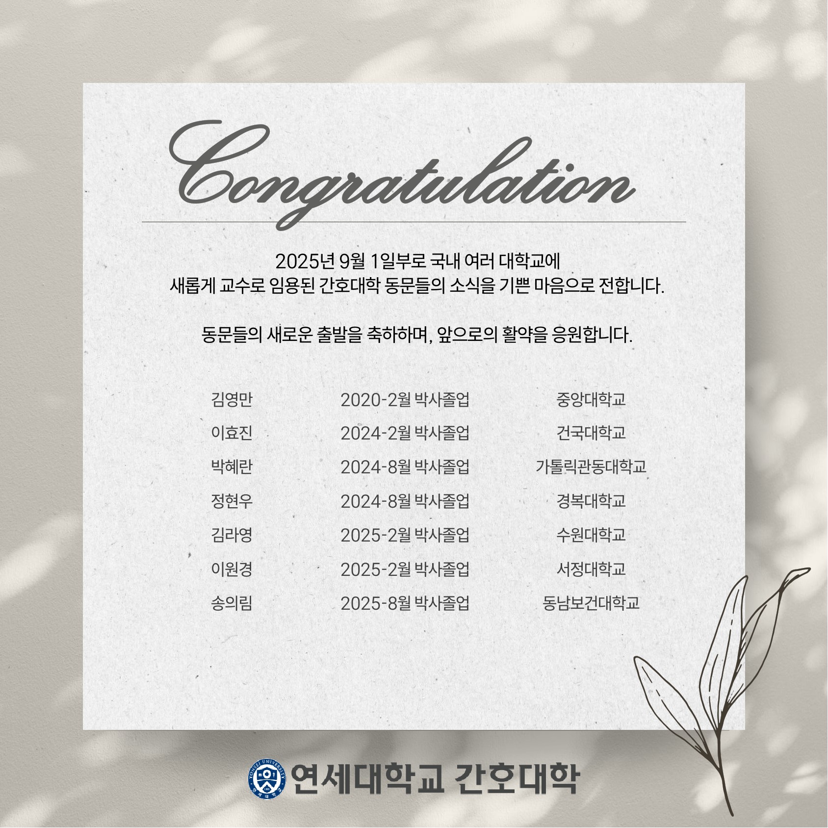 News 간호대학 동문 신규 임용 안내_2025. 9. 1.부 관리자 2025-09-03 조회수 1003 공유하기 공유하기 페이스북 네이버블로그 카카오톡 카카오스토리 닫기 목록 이전글간호대학, 실습경험 성찰활동 우수 에세이 시상식 개최 다음글연세대학교 간호대학생, '유일한 아카데미' 수상